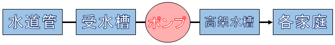 水道管を通って送られてきた水をいったん貯めておくタンクを受水槽と呼び、受水槽の水をポンプでくみ上げて屋上に貯めておくタンクを高架水槽と呼びます。
