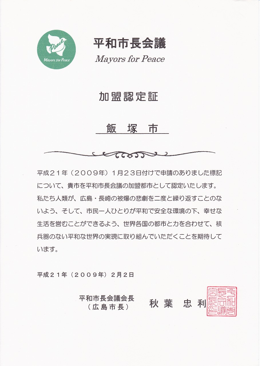 飯塚市は平成21年2月2日に、平和市長会議(平成26年8月6日付けで「平和首長会議」に名称変更)に加盟しました。